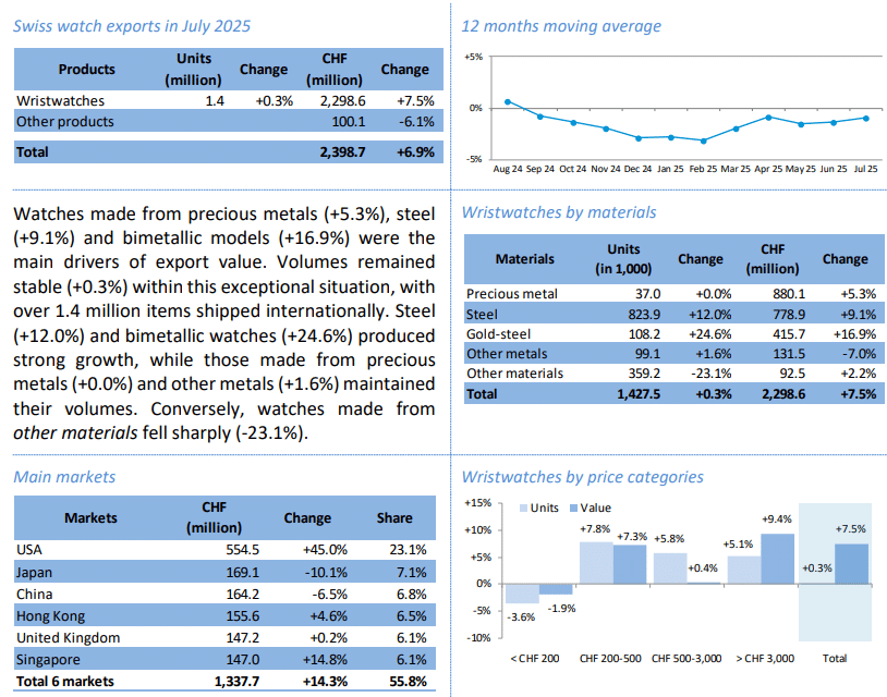 - 2025年7月瑞士鐘錶出口:總值增長6.9%,達到23.987億瑞士法郎(CHF)。這一增長主要受美國關稅不確定性影響,導致提前出貨。若剔除美國市場的影響,出口總值將下降0.9%,顯示其他市場整體疲軟。