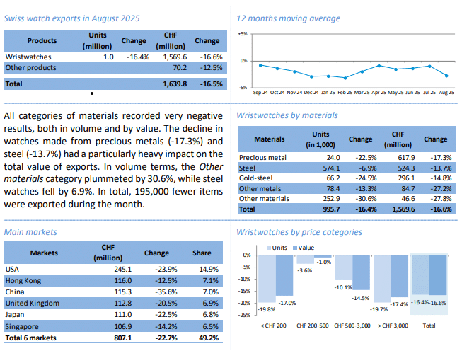 所有主要市場均出現雙位數的下降,特別是美國和中國市場的下降幅度較大。整體來看,瑞士手錶行業在2025年8月面臨了顯著的挑戰。